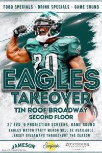 Catch all the Eagles action at Tin Roof Broadway all season long with awesome drink and food specials!!!